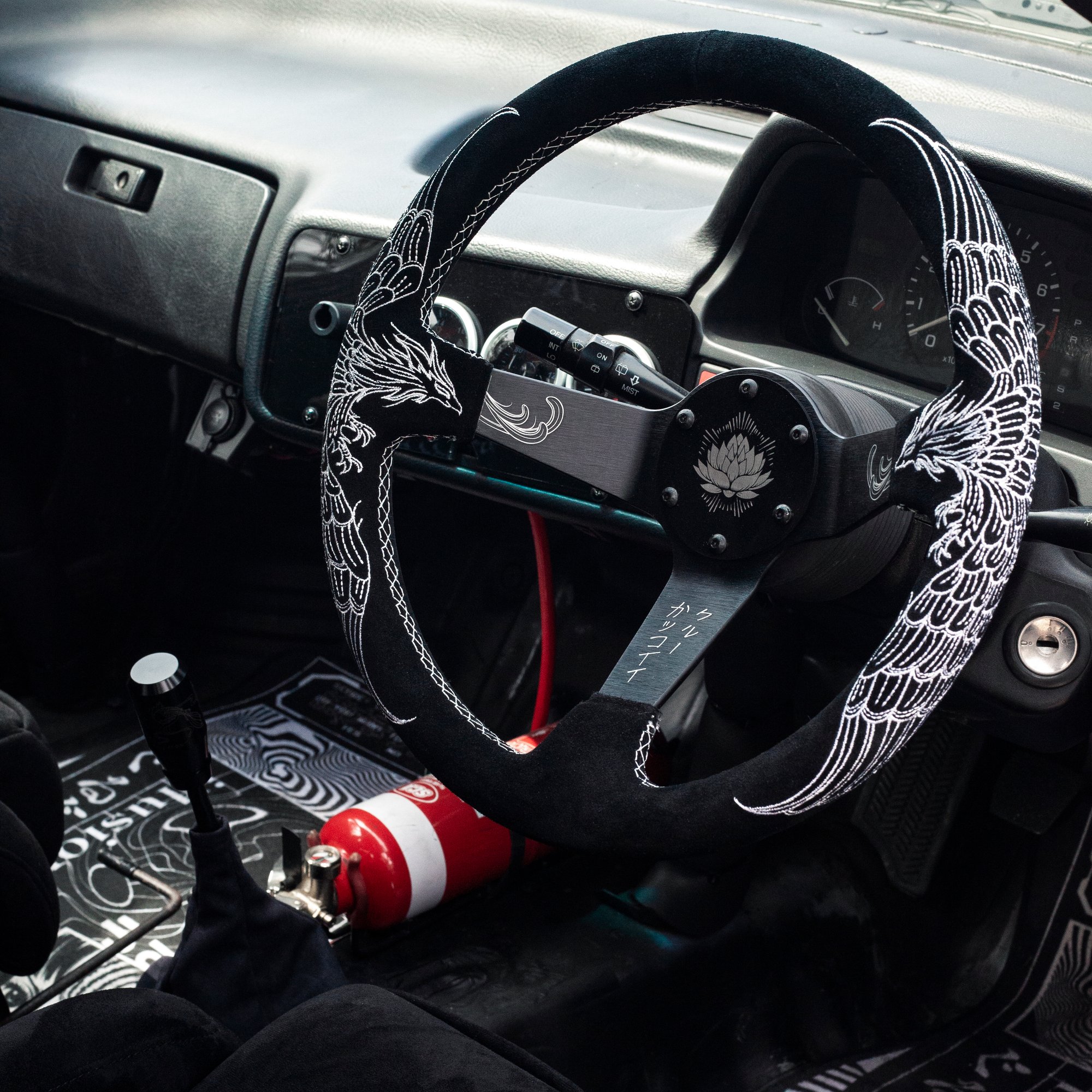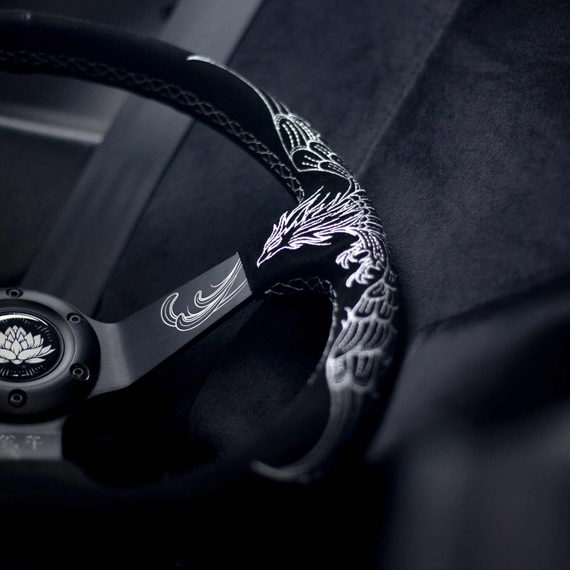 The Twin Phoenix steering wheel features an intricate design of two phoenix facing a lotus flower, representing renewal and growth.